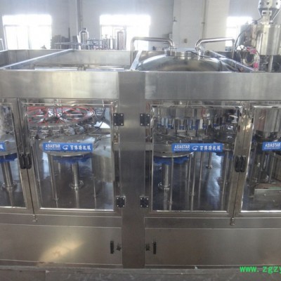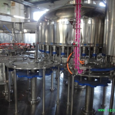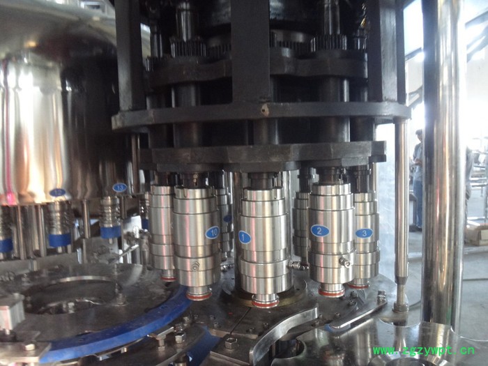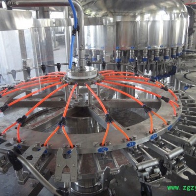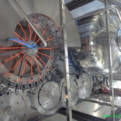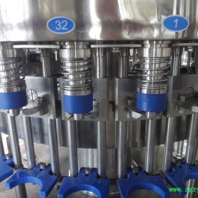 该机的生产过程如下:瓶子通过风道传送至三合一灌装机。冲瓶机的回转盘上装有瓶夹,瓶夹夹住瓶口沿一导轨翻转180°,使瓶口向下进入冲瓶机。在冲瓶机的特定区域,特制喷嘴喷出冲瓶水,对瓶子内壁进行冲洗。瓶子经冲洗、沥干后在瓶夹夹持下沿导轨再翻转180°,使瓶口向上。洗净后的瓶子通过拨瓶星轮由冲瓶机导出并传送至灌装机。进入灌装机的瓶子由瓶颈托板卡住瓶口保持,通过升降机机构在凸轮作用下实现下降下与上升。灌装采用重力灌装方式,瓶口上升顶开灌装阀完成灌装过程。灌装结束后瓶口下降离开灌装阀。瓶子通过卡瓶颈过渡拨轮进入旋盖机。旋盖机上的止旋刀卡住瓶颈部位,保持瓶子直立瓶防止旋转。旋盖头在旋盖机上保持公转并自转,在凸轮作用下实现抓盖、套盖、旋盖、脱盖动作,完成整个封盖的过程。成品瓶通过出瓶拨轮从旋盖机传送到出瓶输送链上,由输送链传送出三合一瓶装机。整机设备采用封闭,封窗高度高于设备**高点,进、出瓶处留有适当的通道,封窗底部留有排风槽。