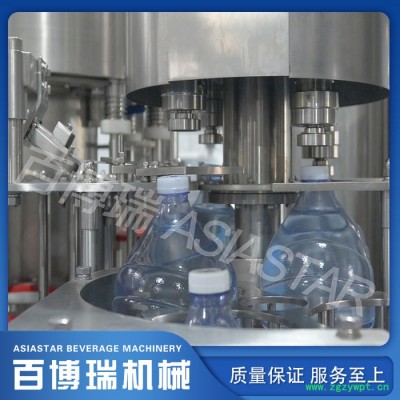 封口:旋盖机上的止旋刀卡住瓶颈部位,保持瓶子直立并防止旋转。旋盖头在旋盖机上保持公转并自转,在凸轮作用下实现抓盖、套盖、旋盖、脱盖动作,完成整个封盖过程。成品瓶通过出瓶拨轮从旋盖机传送到出瓶输送链上,由输送链传送出三合一瓶装机。