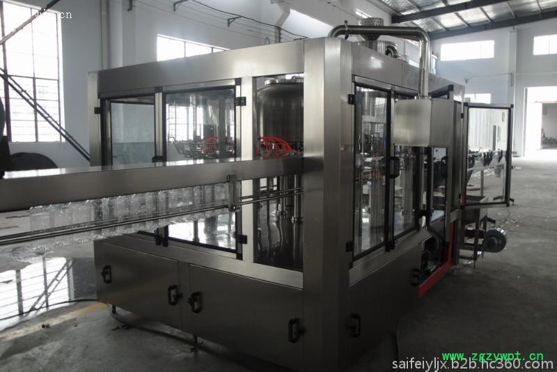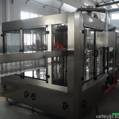 厂家供应纯净水设备 液体灌装机 饮料灌装机特点:本系列设备用于聚脂瓶装各种纯净水、矿泉水的生产。在一机上实现冲瓶、灌装、封盖。整机设计科学合理,外形美观,功能齐全,操作维修方便,自动化程度高。综合采用意大利、德国先进技术。灌装速度快,液面控制稳。采用风送进瓶、夹瓶口、冲洗、卡瓶口灌装、封盖、不受瓶子高矮限制,只要瓶口、瓶盖相同随意更换瓶形,更换一下拔轮板即可。油尼龙齿轮传动,噪声小,整机运转平稳。采用磁力扭矩式拧盖头,实现抓盖、拧盖功能。拧盖力矩无级可调,具有恒力矩旋封塑盖功能,且不伤盖,封口严密可靠。水平回转式气力理盖器,具有不损坏瓶盖表面,料斗内缺盖发信号自动补充盖等功能。整机采用PLC电脑程序控制及人机界面触摸屏按钮,具有料缸内液面自动控制,无瓶不灌装,无瓶不加盖功能,并有拨瓶星轮卡瓶错位停机,盖滑槽内缺盖停机等功能。