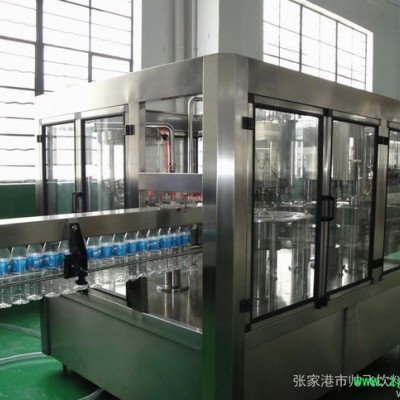 本系列设备用于聚脂瓶装各种纯净水、矿泉水的生产。在一机上实现冲瓶、灌装、封盖。整机设计科学合理,外形美观,功能齐全,操作维修方便,自动化程度高。综合采用意大利、德国先进技术。灌装速度快,液面控制稳。采用风送进瓶、夹瓶口、冲洗、卡瓶口灌装、封盖、不受瓶子高矮限制,只要瓶口、瓶盖相同随意更换瓶形,更换一下拔轮板即可。油尼龙齿轮传动,噪声小,整机运转平稳。采用磁力扭矩式拧盖头,实现抓盖、拧盖功能。拧盖力矩无级可调,具有恒力矩旋封塑盖功能,且不伤盖,封口严密可靠。水平回转式气力理盖器,具有不损坏瓶盖表面,料斗内缺盖发信号自动补充盖等功能。整机采用PLC电脑程序控制及人机界面触摸屏按钮,具有料缸内液面自动控制,无瓶不灌装,无瓶不加盖功能,并有拨瓶星轮卡瓶错位停机,盖滑槽内缺盖停机等功能。