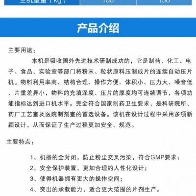 DP系列单冲压片机是吸收国外先进技术研制成功的,它是制药、化工、电子、食品、实验室等部门将粉末、粒状原料压制成片的连续自动压片机。