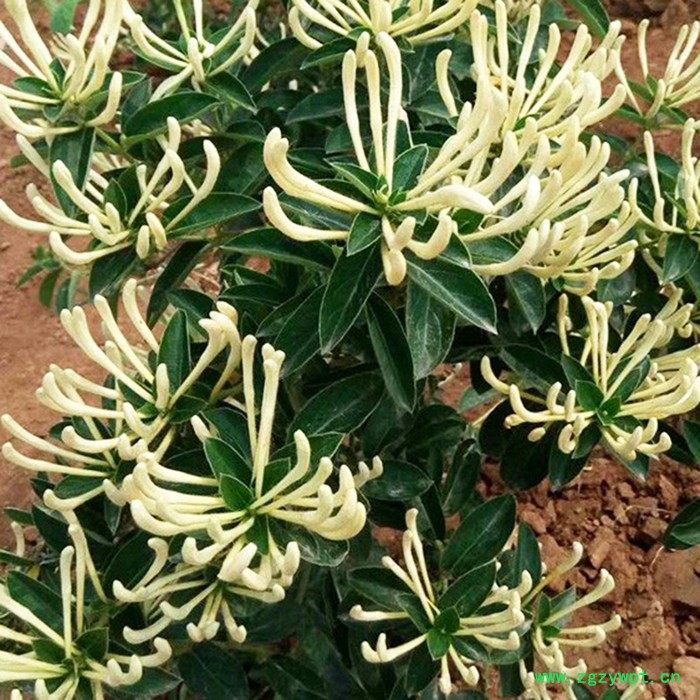 金银花属多年生半常绿缠绕及匍匐茎的灌木。小枝细长,中空,藤为褐色至赤褐色。卵形叶子对生,枝叶均密生柔毛和腺毛。夏季开花,苞片叶状,唇形花有淡香,外面有柔毛和腺毛,雄蕊和花柱均伸出花冠,花成对生于叶腋,花色初为白色,渐变为黄色,黄白相映,球形浆果,熟时黑色。