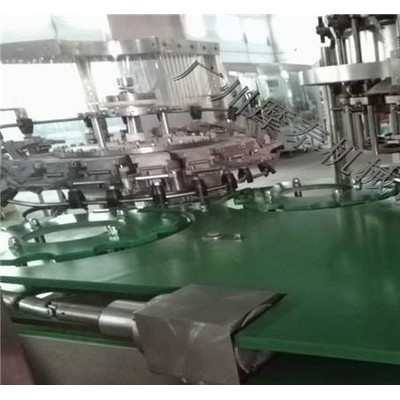 瓶子由瓶子风送系统通过拨瓶星轮传送至三合一灌装机。冲瓶机回转盘上装有瓶夹,瓶夹夹住瓶口沿一导轨翻转180°,使瓶口向下。在冲瓶机特定区域,喷嘴喷出冲瓶消毒液或水,对瓶子内壁进行冲洗。瓶子经冲洗、沥干后在瓶夹夹持下沿导轨再翻转180°,使瓶口向上。洗净后的瓶子通过拨瓶星轮由冲瓶机导出并传送至灌装机。进入灌装机的瓶子由瓶颈托板卡住瓶口保持。灌装阀通过阀升降机构在凸轮作用下实现下降与上升。灌装采用压力灌装方式。灌装阀下降接触瓶口后打开完成灌装过程,灌装结束后灌装阀上升离开瓶口,瓶子通过卡瓶颈过渡拨轮进入旋盖机。旋盖机上的止旋刀卡住瓶颈部位,保持瓶子直立并防止旋转。旋盖头在旋盖机上保持公转并自转,在凸轮作用下实现抓盖、套盖、旋盖、脱盖动作,完成整个封盖过程。成品瓶通过出瓶拨轮从旋盖机传送到出瓶输送链上,由输送链传送出三合一瓶装机。整机设备采用封窗封闭,封窗高度高于设备**高点,进、出瓶处留有适当的通道,封窗底部留有排风槽。