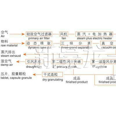 该机采用全封闭形式,所有部件均采用不锈钢制造,配有三级净化装置,过滤后的空气达十万级要求。筒体与顶部装有冷壁装置,使壁温<80℃,干燥塔内装有气刷扫塔装置。经该机干燥后的中药浸膏粉,不会出现焦化变质现象,大大增加了收粉率(95%以上),而且不会产生混药现象和粘壁现象。