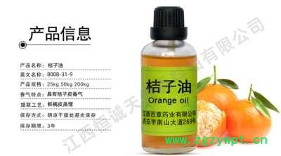 桔子油亦称橘皮油、橘油。由鲜橘皮蒸馏而得的黄色液体。蒸馏得率1.5%~2%,压榨的具有舒适的橘子香气,为橙红至橙褐色挥发性精油,压榨法得率为0.5%左右.