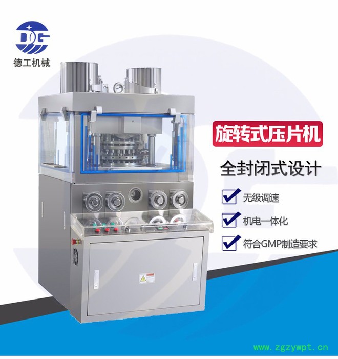 主要用途: ZPW29/ZPW31旋转式压片机是一种双压式自动旋转连续压片的机器,将颗粒状原料压制成片剂。主要应用于制药工业的生产,同时适用于化工,食品,电子,陶瓷等工业部门。根据可以要求,可以压各类异形片、环形片、双色片等不同形状不同大小的片剂。 工作原理: 1外围罩壳为全封闭式,材料采用不锈钢,内部台面用不锈钢材料,能保持表面光泽及防止交叉污染,符合GMP。 2用透明防护罩可以清楚地看到机械操作的情况。且能全部打开易于清洗和保养。