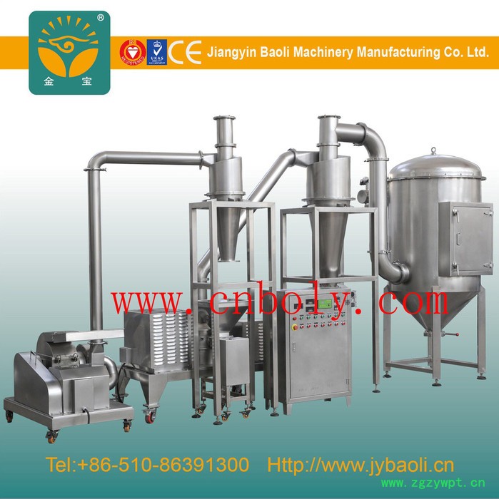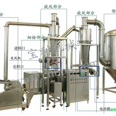 本机由锤片主机、超微主机、旋风分离器、脉冲除尘箱等部分组成,具有无筛、无网、出料粒度均匀等多种性能,生产过程连续进行,能直接将大颗粒装物料粉碎成细粉。该机广泛用于制药、化工、食品行业