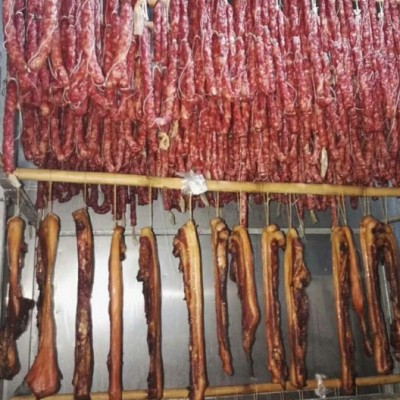 3、快速干燥阶段在这一阶段,制约干燥速度的决定因素是干燥温度,为了强化干燥的速度,温度升高到60-62度,烘干时间控制在22-24小时,相对湿度控制在30%左右,烘房的配置为:3个进新鲜腊肠的烘房,在收缩定型完成后转入快速干燥阶段,前期的烘干时间为:20-25小时。热量**大的时间段在刚进烘房的2小时内加热温度达到65度。