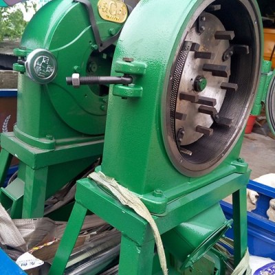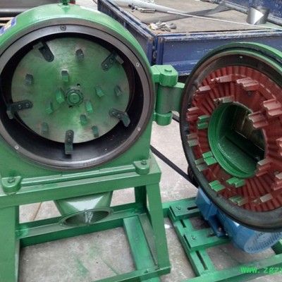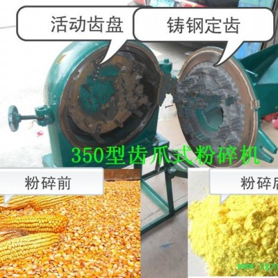 齿爪式粉碎机是一种能将物料粉碎的机械设备。该齿爪式粉碎机,在机座上装有主机,主机包括有机体以及和机体连接在一起的活门组成粉碎室,机体内装有轴承以及由轴承支承的主轴,主轴伸出机体外部的一端装有皮带轮,在粉碎室内的一端装有转子,轴承两端装有内端盖和外端盖,转子上紧固有数圈钢齿,与固定在活门里的齿盘交错配置,活门上端有入料口,入料口上面装有盛料斗,活门下端有出料口。优点是结构简单、合理,可以用多种动力机械驱动,可以筛出不同粗细的物料。可以广泛用于粮食、饲料、化工原料及中草药的粉碎。 齿爪式系列粉碎机,主要工作零件为安装的转子上的扁齿,园齿可以粉碎各种颗粒原料,是目前广泛采用的经济粉设备,具有体积小、重量轻,安装、操作、维修简便,生产效率高等诸多优点。 齿爪式粉碎机主要有上机体、机盖、转子总成、筛网、喂料装置、机架等六部分组成,机体和转子总成共同形成粉碎室,转子总成室主要工作部件,物料的粉碎**在粉碎室完成。当物料进入粉碎室后,在园齿和扁齿的部断打击及揉撞作用下,迅速破碎成细粉和浆状,在离心力和气流作用下,通过筛孔经出料口排出。 本机加工范围广,它既能粉碎玉米、小麦、豆类、杂粮、秸秆、藤蔓、干鲜薯类;叶壳等粮食及饲料,又能粉碎石膏、滑粉、稀土、化工、陶土、等低硬度矿物质等,还可以粉碎多种中药材。本机可用电机和柴油机等配套使用。主要技术参数:项目型号350 主轴转速(转/分)4000-4500 转子直径(mm)350 扁齿数量(个)5 方齿数量(个)长2短9 电机电压(v) 380V配用动力(kw)7.5-11 KW产量(公斤/小时)800-1800 整机重量(公斤)105 外型尺寸(mm)870×700×1100