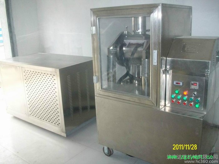中药品种数千种,有许多物料品种是容易发粘的物料,如多含糖、油、树脂类的物料,具体品种如枸杞、熟地、大枣**、蜈蚣、乳香、没药、冰片等,粉碎过程中稍遇热即会发粘,很难成粉,粉碎细度当然也**不理想了。有些粉碎机采取通入液氮的方法迅速冷却磨腔,从而完成粉碎作业,每换一次物料即通入一次液氮,粉碎成本较高,操作比较复杂,液氮温度低,操作不当容易产生危险。 济南达微机械有限公司设计生产的超微粉碎机,粉碎磨腔外有一个水夹套,不需低温粉碎的时候通入常温冷却液或自来水(循环水)即可满足粉碎要求,通入的冷却液或循环水温度不超过25℃,出料温度一般可以控制在45℃之内。如需粉碎粘性物料,在水套内通入**低可达-35℃的冷冻液,冷冻液循环使用无损耗,磨腔内温度始终保持在0℃或更低的温度以下,物料不会发热,且在低温的状态下变脆从而容易粉碎,彻底解决了粘性物料难粉碎的问题。 冷冻机功率有3P、6P、10P、15P、20P、30P、40P等多种配置供用户选择,冷冻液制冷温度**低可达-50℃,磨机控制面板配有温控仪,可以始终监测冷冻液的制冷温度,而且可以调节上、下限,制冷温度随物料特性自由控制,配有冷冻机的设备自带冷冻液,无需自来水管道等。冷冻液的整个循环过程是在密闭的状况下进行,无损耗,粉碎成本当然非常低。配有制冷设备的磨机,非常适合粉碎粘性物料,适应物料品种范围广,是各大药厂、实验室、高校科研机构、研究所等客户理想的超微粉碎设备。 XDW-6B 用于试验及小批量生产