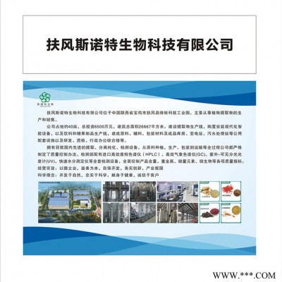 扶风斯诺特生物科技有限公司是一家专业从事植物提取物、有效单体和有效成分开发研究、提纯加工、工艺转让、技术合作的高新技术企业。产品主要用于保健品、化妆品、饮料及食品等行业。公司科研实力雄厚,拥有目前国内先进的提取、分离纯化、检测设备。多名业内人士组成年富力强的研究、开发团队。