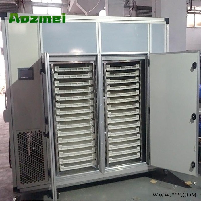 烘干机主要构造: 1、 主机:热泵烘干除湿机(热泵烘干机利用输入很少的电能吸收空气中的免费热量,用来烘干物料) 2、 烘干房:聚氨酯发泡保温库房(定制),用来摆放物料,以及保温以免热量散失。 3、 烤房循环系统:热风循环系统,将热量带到烘干房的每个角落提升烘干房的温度,并将物料蒸发出来的水分带走。 4、 排湿排水系统:将烤房里边的高温湿热的空气大部分冷凝变成水排掉,多余的水汽通过风机排出。 5、 全自动智能控制系统:按照合适的烘干工艺曲线,自动调节温度和湿度、烘干时间。 6、 高效节能技术:高效废热回收除湿装置,比普通热泵烘干机提升能效30%。