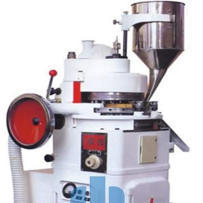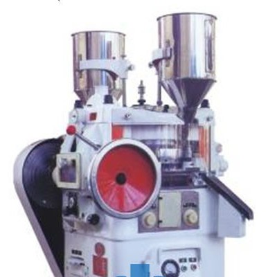 本机用以将各种颗粒状原料压制成圆形片状,是适合批量生产的基本设备,其结构为双压式,有两套加料装置和两套压轮。转盘上可装33付冲模,旋转一周即可压制66片,压片时转盘的速度、物料的充填深度、压片厚度均可调节。机上的机械缓冲装置可避免过载而引起的机件损坏。机内配有吸粉箱,通过吸咀可吸取机器运转时产生的粉尘,避免粘结堵塞,并可回收原料重新使用。