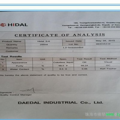 喷墨制造原料、医药制造原料、化妆品制造原料、食品加工原料,无色无味的液体;具有防腐功能,在化妆品、食品加工、药品制造、喷墨制造原料中所需必要成分之一;由于化妆品、食品加工、药品制造、喷墨制造,原料中防腐剂成分Paraden被美国FDA食品药物安全管理所检测出致癌物质,目前国际品牌的大部分化妆品制造厂、食品加工业、药品制造工厂、喷墨制造公司开始研发新原料代替Paraden,目前开始使用的**有,欧美、法国、日本等先进**正在使用的1,2-Hexanedio;对人体无害、具有抗菌、抑制细菌再生、替代防腐剂、高效保湿效果等功能。