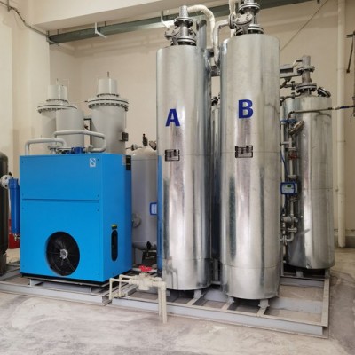 变压吸附制氮设备是采用碳分子筛作为吸附剂,在一定的压力下,利用空气中的氧、氮在碳分子筛孔隙中扩散速率不同而达到分离空气的目的。即碳分子筛对氧的扩散吸附远大于氮,通过可编程序控制器来控制多个阀门的导通、关闭,达到两只吸附塔的交替循环工作:加压吸附,减压脱附的过程,从而完成氧、氮的分离,得到用户所需纯度的氮气。