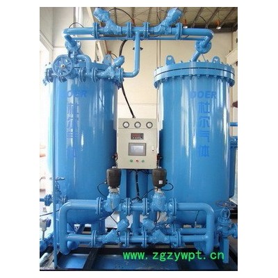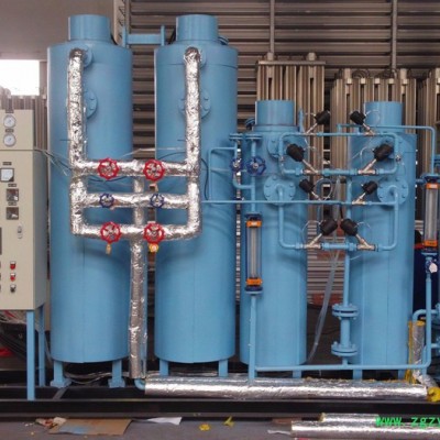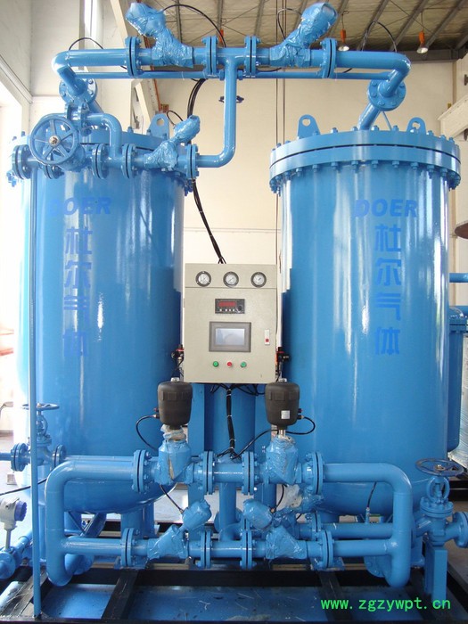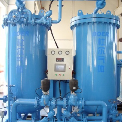 露点≤-40℃. 氮气纯化装置: 氮气纯化装置用于各种压力的氮气进行纯化,以纯度大于98%的普氮为原料气,采用钯触媒催化剂或碳脱氧剂,除掉氧气,在经过干燥除水。处理气量为:1Nm3/h--3000Nm3/h。出口压力为:0.05MPa--0.7MPa可以根据客户要求设计。 特点: 1、成本低:采用催化剂除氧和干燥,是一种简便的工艺方法,能耗低、结构紧凑,其成本低于其他方法获得高纯氮。 2、性能可靠:由于连续除氧,钯触媒无需再生且使用寿命可达五年以上,微热再生(自动)能耗更低并且操作自动,可达到连续产气的目的。 3、氮气纯度高:由仪器检测微量氧、微量水,确保所需氮气纯度。 4、选用**进口气动阀,由PLC控制,可保证装置稳定可靠运行。