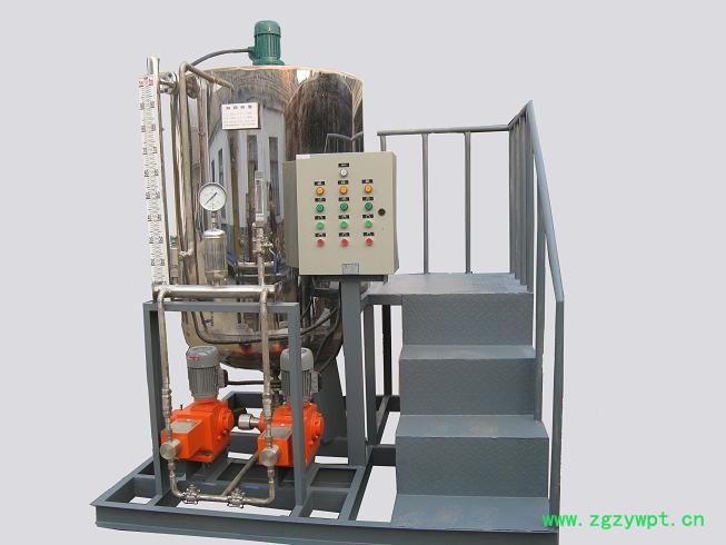 固体药剂加入溶药箱内,然后按比例加入除盐水或凝结水搅拌溶解,由计量投加系统加到锅炉汽包内,投加控制可采用手动方式,也可依据上位系统输出的控制信号,进行随动控制,自动投加。