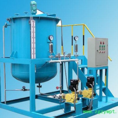 加药装置概述: 在水处理、化工、印染等行业,需向水中或其它液体中按比例的投加另一种溶液,其生产过程是连续的,如水处理中投加混凝剂、助凝剂、消毒剂、冷却塔投加阻垢剂、化工、印染中定时定量投加一定量的化学药剂、酸碱等,这些都需要一种既能配制溶液,又能定量定时投加药剂的设备,而这正是我们的JY系列加药装置所需具备的基本性能。 选用说明: 1、选用时首先要根据投加情况,确定投加方式,一般选二台,其中一台备用。 2、喷射器加药,要求冲射水进水压力>2.5Kg/cm2。 3、设备只需放置在平整地坪上即可,不需基础与固定。 4、设备上排放阀接口全部为活接头,排放法兰可任意调整方位。 5、如用户对溶药槽、贮药液槽需特殊规格,其外形尺寸可改变。 配置: 搅拌箱体一台 成药箱一只 加药泵一台 流量计一台 其他管道