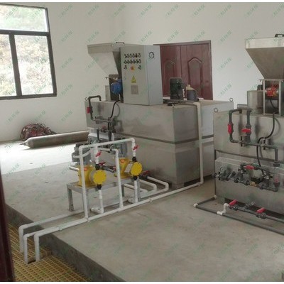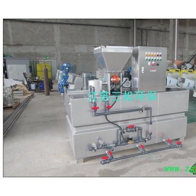 本装置是粉状药剂的全自动连续配置及投加系统。干粉药剂从料斗下部的螺旋推进器进入预混器与清水进行预混,被湿润的物料进入配制槽进行稀释混合,按用户要求浓度进行配制;配制溶液从配制槽经熟化槽再进入储存槽,当储存槽液位处于高位时,配制过程自动停止,当溶液下降到低液位时,自动启动配料过程。配制槽和熟化槽均设置搅拌器,充分保证药剂的稀释和熟化。配制流量及浓度可通过调节进水流量和调节螺旋轴转速来确定。