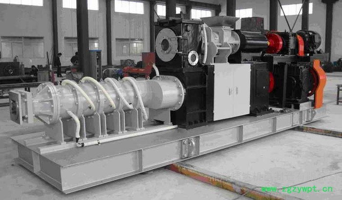 SCR蜂窝催化剂挤出机TCJ310 SCR蜂窝催化剂挤出机是炜达公司引进国外先进技术,并结合本国生产条件研制的催化剂专用挤出机。本设备具有很高的机械强度,其主要特点是具有很大的挤出力**高可达100kg/cm. 本机凡与原料接触的部分都采用不锈钢材质,原料在本机内的运行部位如上泥箱,真空室,挤出轴,出泥筒,螺旋叶都采用冷却水循环冷却,充分保证原料出塑加工过程中符合严格的温升要求。本机经多家知名用户使用,其性能完全达到国外同类产品水平,部分性能甚至超过国外同类产品。该机主要特点:1. 采用内外水冷却(或加热)方式,保证产品挤出不变形,不开裂2. 挤出力高达10MPA,挤出速度快,产量高3. 对挤出温度和压力采取实时监控(均采用数字显示方式)(1)生产能力:1.5~2.0M/min(2)上轴转速:32.5转/分(3)下轴转速:21.4转/分(3)挤泥螺旋直径:310mm(3)挤泥压力:≥8MPa(3)启动离合器工作压力:0.5~0.8Mpa(3)真空度:-0.094Mpa(3)上部电机功率:37Kw(4)下部电机功率:75kw(8)外形尺寸:约6000×1700×1800毫米(9)全机净重:12000千克