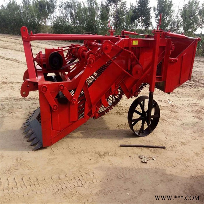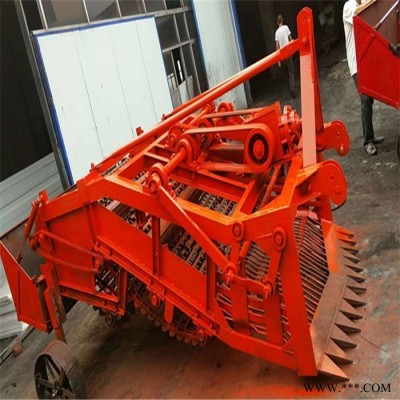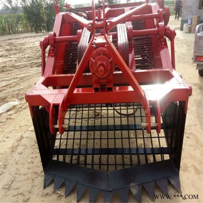 拖拉机后输出轴带动药材收获机。通过拖拉机后升降臂,中间拉杆连接固定收获机,调节好深度,然后开动机器,松土铲插土壤中,将药材的根茎从土壤中铲出,根茎连同土块进入振动筛上,对包裹药材根茎的土块进行振动操作,振动掉一部分土块。振动后的土块和药材根茎进入振动筛上,再漏掉一部分土块,压辊可以把大的土块碾压成小的土块,对小的土块进行进一步振动,经过碾压振动后的土块和药材根茎压碎的土块从筛子底部漏掉,药材和土大部分分离。节省人力物力,大大提高收获效率。