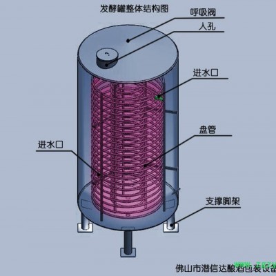 发酵罐是一种用于发酵工艺的装载容器,内有2~3层盘管冷水控制,可根据客户对酒的工艺进行调节控制发酵温度,同样发酵设备内有自动输送物料系统,只需按钮一按,物料便自动输送至蒸馏设备中去,可省去几十人的运料人工,而且输送物料速度较快,产量客观,卫生环境也不会受到影响。