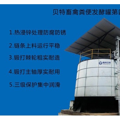 畜禽粪便发酵罐是利用好氧微生物发酵菌对放置在密闭圆柱罐中的粪便进行无害化处理的发酵设备。这种处理设备可对畜禽粪便进行全封闭发酵处理,不仅彻底杀灭有害细菌和病原体,而且对环境无任何污染,解决了粪便堆放晾晒容易产生恶臭的问题,具有良好的生态效益、经济效益和社会效益。