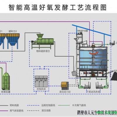 智能高温好氧发酵处理工艺是将有机废弃物和生物质(粉碎后的锯末、稻壳、 玉米秸秆、玉米芯、花生壳等)以及返混料按照一定比例混合,具备发酵条件进 入处理系统,通过高压送风系统向物料中不断送氧,在好氧发酵菌的作用下,有 机物不断分解,产生大量高温,促进物料中的水分蒸发,同时在高温状态下杀灭 病原体、寄生虫、以及杂草种子,达到无害化、减量化、稳定化的处理目的;发 酵后的物料可作为有机肥原料、园林绿化,实现资源化利用。