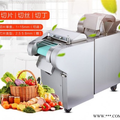 包含单切机的所以功能的同时,也可切圆形如土豆、萝卜等。可将根、茎、叶等蔬菜加工成片、丝、丁、菱、曲线、花丁、花片等。切片装置用于硬菜(萝卜、土豆、水果、薯类)的切片,厚度在1-10毫米内自由调整;往复竖刀将刀成的菜片或软菜(韭菜、芹菜)切成直丝或段、曲线丝、方丁(或形刀)输送带每次移动距离1-20毫米自由调整。所调整量即为丝段的宽度;应注意被切菜直径较粗时(大于30毫米)出片效果才好,便于切丁,直径小时制的片或丁将会杂乱。被切菜加工面平整光滑、规则,组织完好,保持手工切制的效果。