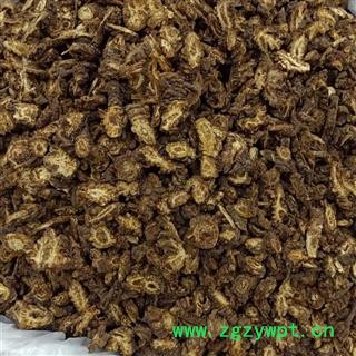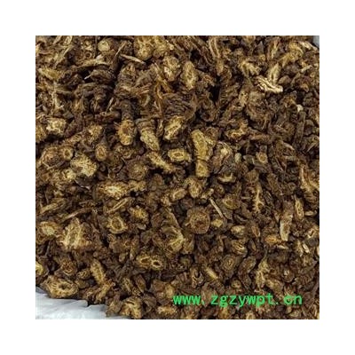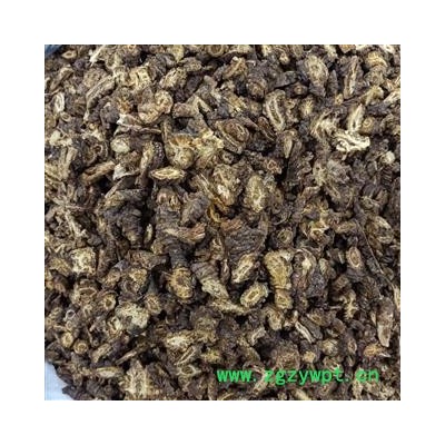 【性 状】:本品螺丝羌。为干燥的根茎部,形态似蚕。呈圆柱状或略弯曲,长约4~10厘米,直径约1~2厘米。顶端有茎叶残基。表面棕褐色,有多数紧密而隆起的环节。节上密生疣状突起的须根痕。质轻松易折断,断面不齐,有明显的菊花纹和多数裂隙,皮部棕红色;木质部淡黄色,中央有黄白色髓,均有朱砂点(油管)。具特殊香气,味微苦而麻。