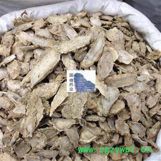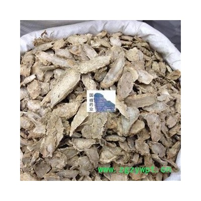 [性 状]:该品呈长圆形或不规则的片状,大小不一,长3~6cm,宽1~3cm,厚片姜黄0.1~0.4cm。外皮灰黄色,粗糙皱缩,有时可见环节及须根痕。切面黄白色至棕黄色,有一圈环纹及多数筋脉小点。质脆而坚实。断面灰白色至棕黄色,略粉质。气香特异,味微苦而辛凉。