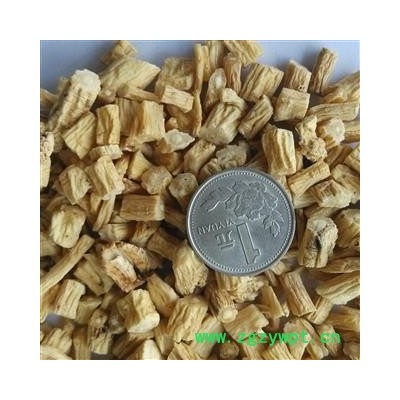 性状颜色:圆丁形状直径0.5厘米,烘干表面黄白色,少许硫磺烟熏,断面黄白色,半透明,中柱细小。