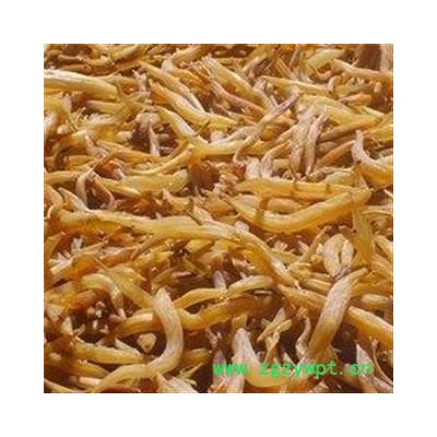 【性状】本品呈长纺锤形,略弯曲,长5~18cm,直径0.5~2cm。表面黄白色至淡黄棕色,半透明,光滑或具深浅不等的纵皱纹,偶有残存的灰棕色外皮。质硬或柔润,有黏性,断面角质样,中柱黄白色。气微,味甜、微苦。