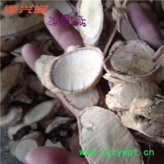 [性 状]:该品圆柱形,长短不一,直径且1.5-2.5cm;或已切成圆形厚片。外皮黄色或橙红色,具显著的纵皱纹及少数须根痕。栓皮薄而易脱落。质地坚硬,不易折断,断面皮部薄,灰黄色,具韧性纤维,木部占绝大部分。黄色,柴性,导管孔明显,有的中央部位有小髓。气微,味淡。