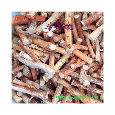 [性     状]:该品根略呈圆柱形,有分枝,长短不一,直径0.2-2.5cm,表面灰棕色或褐色,有纵皱纹,可见明显的横向皮孔及须根痕。部分栓皮脱落后露出黄色皮部。质坚硬,难折断,断面呈纤维性。通常厚1-1.5cm,皮薄,木部呈黄白色,有众多同心环,可见放射状纹理,皮部与木部易分离。气微香,味甘。