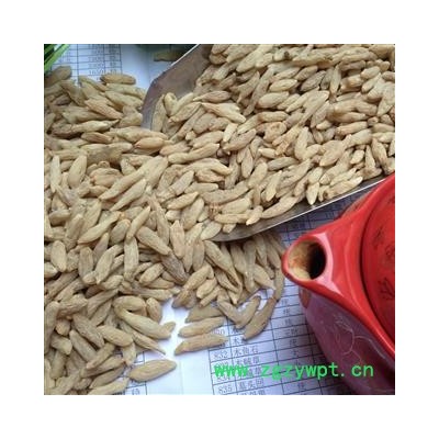 [性 状]:本品呈纺锤形,两端略尖,长1.5~3cm,直径0.3~0.6cm。表面黄白色或淡黄色,有细纵纹。质柔韧,断面黄白色,半透明,中柱细小。气微香,味甘、微苦。