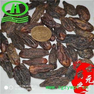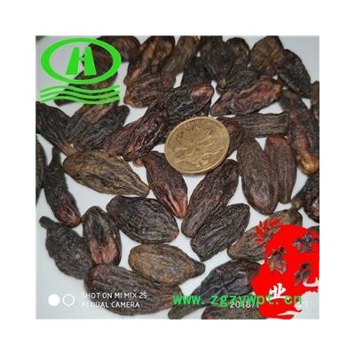 【性 状】表面黑褐色,具有明显的纵皱纹,一端较大,另一端略小,钝尖,下部有果梗痕。质坚硬。断面褐色,有胶质样光泽,果核不明显,常有空心,小者黑褐色,无空心
