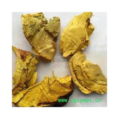 【性 状】呈类圆形,稍扭曲,外皮灰棕色,有细皱纹,昜剥落。质坚硬,切面不平坦,鲜黄色
