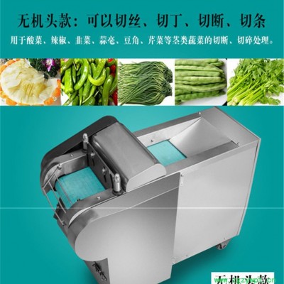 包含单切机的所以功能的同时,也可切圆形如土豆、萝卜等。可将根、茎、叶等蔬菜加工成片、丝、丁、菱、曲线、花丁、花片等。切片装置用于硬菜(萝卜、土豆、水果、薯类)的切片,厚度在1-10毫米内自由调整;往复竖刀将刀成的菜片或软菜(韭菜、芹菜)切成直丝或段、曲线丝、方丁(或形刀)输送带每次移动距离1-20毫米自由调整。所调整量即为丝段的宽度;应注意被切菜直径较粗时(大于30毫米)出片效果才好,便于切丁,直径小时制的片或丁将会杂乱。被切菜加工面平整光滑、规则,组织完好,保持手工切制的效果。