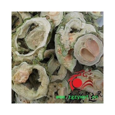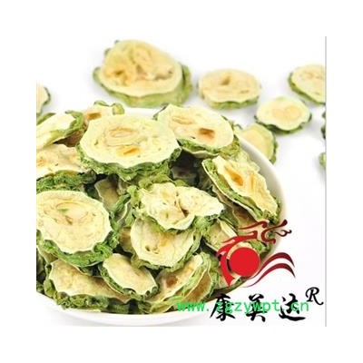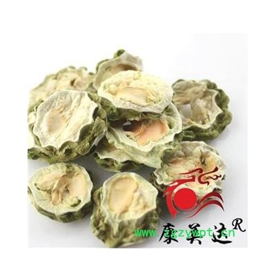 性状:苦瓜干为椭圆形或长圆形片块,厚0.2~0.3厘米,长3~15厘米或过之,宽2~4厘米;切口边缘皮部青绿色,苦瓜干皱缩不平,中间瓤部白色或黄白色,少数红色,柔软而微有弹性,其内嵌生近长圆形而扁的种子5~10枚,种子脱落后常留下孔洞。质略韧,不易断。气微,味苦。以青边、肉白、片薄、种子少者为佳。