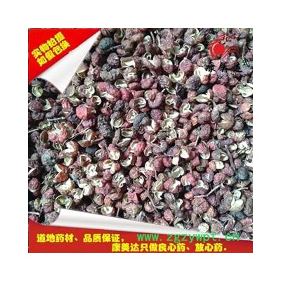 [性 状]:蓇葖果多单生,直径4 ~5mm。略呈球状,裂开为两瓣。外表面紫红色或棕红色,散有多数疣状突起的油点,直径0.5~1mm,对光观察半透明;内表面淡黄色。香气浓,味麻辣而持久。