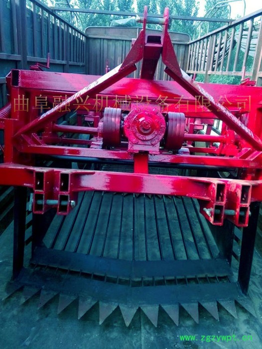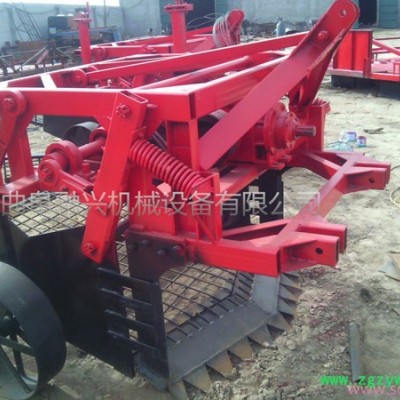 曲阜融兴药材收获机在于克服现有技术中的缺陷,提供一种结构简单、方便实用,省时省力和工作效率高的根茎类药材收获机,工作原理:经悬挂架将本机固定在大型**拖拉机后悬挂上,变速箱经动力输入轴与拖拉机上的输出轴相连接,开动机器,松土铲插入土壤中(如果深度不够,可以把拖拉机后边所带的上拉杆调短),将药材的根茎从土壤中铲出,根茎连同土块进入振动筛上,对包裹药材根茎的土块进行振动操作,振动掉一部分土块,振动后的土块和药材根茎进入前传输带上,再漏掉一部分土块,在前传输带运输的过程中,机子自带的碎土压辊可将大土块碾压成小土块,经过碾压处理后的土块和药材根茎进入后传输带上,压碎的土块经后传输带漏掉,后传输带将药材根茎送入回收箱内,完成药材的收割回收,网状式输送带可对药材根茎进行98%以上的回收,大大提高了工作效率。