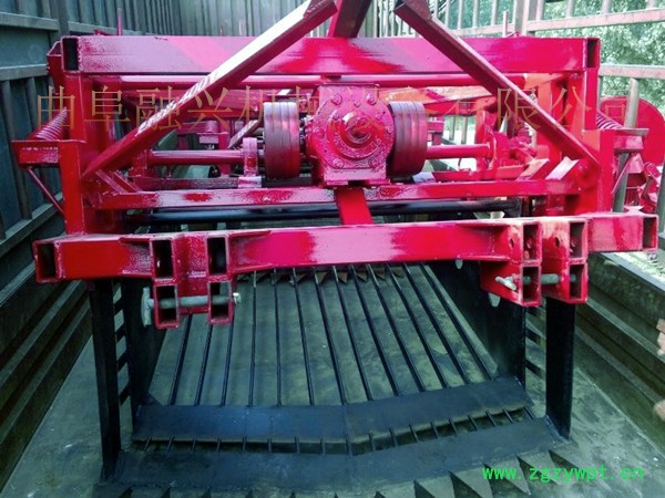 曲阜融兴药材收获机在于克服现有技术中的缺陷,提供一种结构简单、方便实用,省时省力和工作效率高的根茎类药材收获机,工作原理:经悬挂架将本机固定在大型**拖拉机后悬挂上,变速箱经动力输入轴与拖拉机上的输出轴相连接,开动机器,松土铲插入土壤中(如果深度不够,可以把拖拉机后边所带的上拉杆调短),将药材的根茎从土壤中铲出,根茎连同土块进入振动筛上,对包裹药材根茎的土块进行振动操作,振动掉一部分土块,振动后的土块和药材根茎进入前传输带上,再漏掉一部分土块,在前传输带运输的过程中,机子自带的碎土压辊可将大土块碾压成小土块,经过碾压处理后的土块和药材根茎进入后传输带上,压碎的土块经后传输带漏掉,后传输带将药材根茎送入回收箱内,完成药材的收割回收,网状式输送带可对药材根茎进行98%以上的回收,大大提高了工作效率。