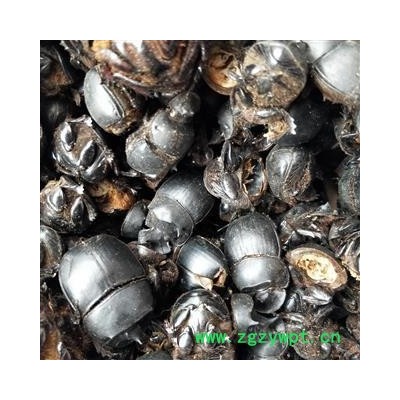 药材性状:虫体呈椭圆形,长3-4cm,宽1.8-3cm,黑褐色,有光泽。雄虫较雌虫稍大,头部前方呈扇面形,易脱落,中央具角突1支,长约6mm。前胸背板呈宽关月形,顶部有横形隆脊,两侧各有角突1枚,后胸约占体长的1/2,为翅覆盖。雌虫头部中央及前胸背板横形隆脊的两侧无角状突。前翅革质,黑褐色,有7条纵向平行的纹理,后翅膜质,黄色或黄棕色。足3对,体质坚硬。