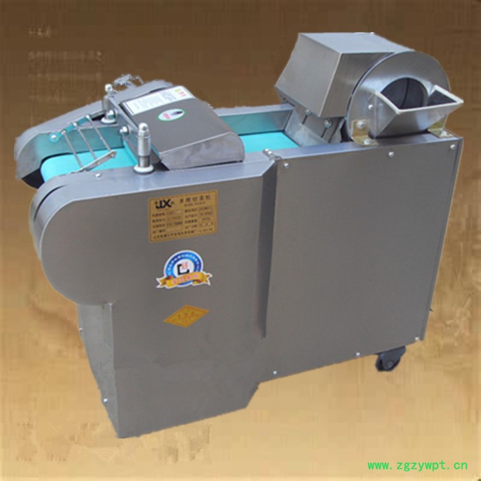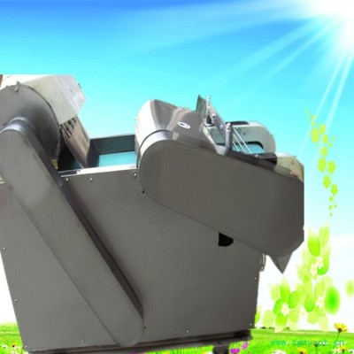 多功能型切菜机包含单切机的所有功能的同时,也可切圆形如土豆、萝卜等。 可将根、茎、叶等蔬菜加工成片、丝、丁、菱、曲线、花丁、花片等。切片装置用于硬菜(萝卜、土豆、水果、薯类)的切片,厚度在1-10毫米内自由调整;往复竖刀将刀成的菜片或软菜(韭菜、芹菜)切成直丝或段、曲线丝、方丁(或形刀)输送带每次移动距离1-20毫米自由调整。所调整量即为丝段的宽度;应注意被切菜直径较粗时(大于30毫米)出片效果才好,便于切丁,直径小时制的片或丁将会杂乱。被切菜加工面平整光滑、规则,组织完好,保持手工切制的效果。具有外形美观,操作简单,使用维修方便等特点。可切香葱、香菜、菠菜、韭菜、韭蒜、芹菜、豆角等茎杆茎叶物料段形,也可以切海带、荷叶、烟草成丝状,宽度自由调节。