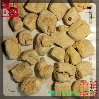 【性 状】方形或长方形的块状,宽约3厘米,厚约1厘米,外表土黄色,粗糙;质硬脆易断,断面不平,类白色,可见未被粉碎的褐色残渣及发酵后的空洞。有陈腐气,味苦。
