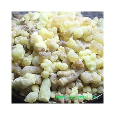【性 状】长卵形滴乳状、类圆形颗粒或粘合成大小不等的不规则块状物。大者长达2cm(乳香珠)或5cm(原乳香)。表面黄白色,半透明,被有黄白色粉末,久存则颜色加深。质脆,遇热软化。破碎面有玻璃样或蜡样光泽。具特异香气,味微苦