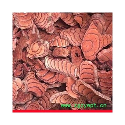 【药材性状】本品为椭圆形、长矩圆形或不规则的斜切片,厚0.3-1cm。栓皮灰棕色,有的可见灰白色斑栓皮脱落处显红棕色。质坚硬。切面木部韧皮部有树脂状分泌物呈红棕或黑棕色,与木部相间排列呈数个同心性椭圆形或偏心性半圆形环;髓部偏向一侧。