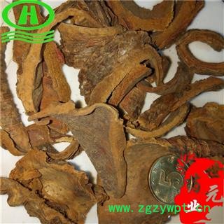 【性 状】长条状或稍扭曲而卷成槽状,长短及宽度不一,厚2~5㎜,外表面粗糙,深灰棕色,具纵横皱纹,并有横向灰色皮孔