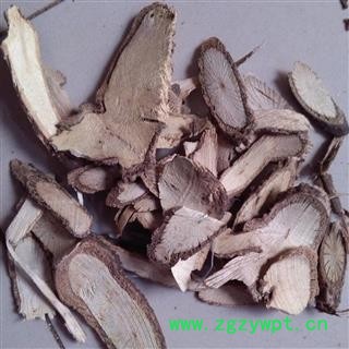 【药材性状】:直径1.2~2厘米。表面灰褐色,外皮极粗糙而有许多不规则裂纹,节不明显,仅可见侧枝断痕。质坚硬,难折断,断面显纤维性,皮部较厚,黄褐色,木部黄白色,密布细孔洞的导管,夹有灰黄色放射状花纹。中央具小形的髓。气微弱,味苦而涩。以条匀,内色黄者为佳。